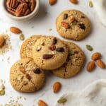 The image shows five round, golden-brown cookies with a slightly cracked surface, each topped with a few nuts and seeds, arranged casually on a white cloth on a white marbled surface. Around the cookies, there are scattered almonds, pumpkin seeds, sesame seeds, and other small nuts adding texture and color contrast with their light brown, green, and cream tones. In the background, there is a small white bowl filled with mixed nuts. The overall look is rustic and inviting, with warm earthy colors and a cozy setting. Photo taken with an iphone --ar 4:5 --v 7