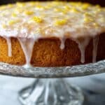 A close-up image of a single-layer round cake with a golden-brown crust and a shiny, thick white glaze dripping down the sides. The glaze has small yellow spots that look like lemon zest or butter pieces spread unevenly across the top. The cake is placed on a clear glass cake stand with an ornate design, set on a white marbled surface. The background is softly blurred to keep the focus on the cake. photo taken with an iphone --ar 4:5 --v 7