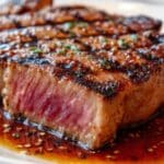 The image shows a close-up of a thick grilled steak slice with visible grill marks on top. The outside is browned and slightly crispy, with a pink and juicy inside layer that looks tender. The steak rests on a white plate with a dark, glossy sauce around it, which has a rich, oily texture and small bits of seasoning. The background is a white marbled surface. photo taken with an iphone --ar 4:5 --v 7