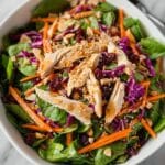 This vibrant and refreshing Asian Chicken Cranberry Salad combines shredded chicken, colorful mixed greens, crunchy vegetables, dried cranberries, nuts, and a tangy sesame ginger dressing for a delicious and nutritious meal that’s quick to prepare and perfect for any occasion.