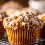 These bakery-style coffee cake muffins feature a tender crumb with a cinnamon sugar swirl inside, topped with a buttery crumb streusel and a sweet vanilla glaze. Perfect for breakfast or brunch, these muffins are moist, fluffy, and packed with cinnamon flavor in every bite.