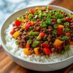 This Beef and Pepper Rice Bowl is a quick and easy one-pan meal packed with tender ground beef, colorful bell peppers, and savory seasoning. Served over fluffy rice, it’s a flavorful and satisfying dish perfect for busy weeknights or meal prepping.