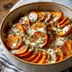 A deliciously creamy and sweet side dish featuring tender scalloped sweet potatoes baked in a rich brown sugar cream sauce with warm spices and an optional gooey marshmallow topping.
