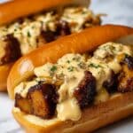 The image shows two sandwiches with three layers each inside glossy, golden brown soft buns. The bottom layer contains chunky pieces of dark brown grilled or fried meat with a crispy texture. On top of the meat, there is a thick layer of creamy light tan sauce with visible specks of herbs and spices, drizzled generously and spilling over the sides. The sandwiches rest on a white marbled surface, with no other elements visible. photo taken with an iphone --ar 4:5 --v 7