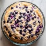 A round glass bowl filled with a thick, light beige batter mixed with whole blueberries, some of which have burst and spread purple juice throughout the top layer. The top surface is slightly uneven with small cracks and browned spots, indicating it has been baked just enough to hold its shape. The batter’s texture looks soft and moist with the blueberries standing out as dark blue and purple spots scattered evenly across the upper layer. The bowl is placed on a white marbled surface. photo taken with an iphone --ar 4:5 --v 7
