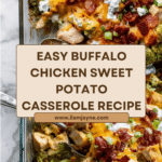 Buffalo Chicken Sweet Potato Casserole is a flavorful and hearty dish combining tender chicken, roasted sweet potatoes, and crunchy broccoli with a spicy buffalo kick. Topped with cheddar cheese, green onions, and turkey bacon, it makes a satisfying meal perfect for weeknights or meal prep. With just 10 minutes of prep and under an hour total cook time, this casserole is both easy and delicious.