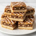 The image shows several square pieces of dessert bars stacked together on a white plate with ridged edges, placed on a white marbled surface. Each bar has a slightly golden brown crust base, topped with a thick layer of nutty mixture that includes whole pecans or walnuts adding texture with a slightly glossy finish. The bars are drizzled with a light, creamy white glaze that clings irregularly across the nut topping, giving a sweet and sticky look. The edges of some bars are slightly darker, showing baked crispness, and the bars appear moist and chewy inside. Photo taken with an iphone --ar 4:5 --v 7