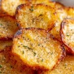 The image shows a close-up of several round, golden-brown roasted potato slices arranged closely together. Each potato slice has crispy, slightly curled edges with a crunchy texture and a soft, tender inside. There are small specks of black pepper and tiny green herbs sprinkled evenly over the top, adding a touch of color contrast. The potato slices rest on a white marbled surface. The lighting brings out the warm tones and texture details of the potatoes. Photo taken with an iphone --ar 4:5 --v 7