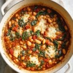A creamy, flavorful butter beans recipe cooked in a savory tomato and garlic sauce, enriched with spinach and Parmesan cheese, finished with a golden bubbly mozzarella broil topping. A comforting and nutritious dish perfect as a main or side.