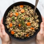 A close-up top view of a black bowl filled with creamy mixed wild rice and vegetables. The dish has a textured layer of soft, beige rice mixed with dark brown wild rice grains and bright orange carrot pieces scattered throughout. Fresh green herbs are mixed evenly and a couple of sprigs of fresh thyme lay on top as garnish. A silver spoon is inserted on the right side of the bowl while two woman's hands hold the bowl from the sides. The background is a white marbled texture. Photo taken with an iphone --ar 4:5 --v 7