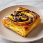 A square-shaped pastry with multiple layers, the bottom and sides are golden brown and flaky; the inside has swirls of dark brown chocolate mixed with a yellow custard-like filling. Small chunks of chocolate are scattered on top, slightly melted and glossy. The pastry is placed on a simple white round plate, which rests on a white marbled surface. photo taken with an iphone --ar 4:5 --v 7