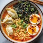 This Dumpling Ramen Bowl recipe combines tender frozen dumplings, flavorful chicken broth, and soft-boiled eggs with fresh spinach and instant ramen noodles for a comforting and easy-to-make meal. Enhanced with soy sauce, sesame oil, green onions, and black sesame seeds, this dish offers a delightful balance of textures and savory tastes perfect for any day.