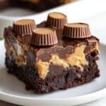 A close-up view of a square brownie sits on a white plate with a white marbled background. The brownie has three visible layers: the bottom layer is dark brown and moist with a rich chocolate texture; the middle layer is creamy and light brown, showing smooth peanut butter embedded within the brownie; the top layer is a shiny, firm dark chocolate coating. On top, there are several halved peanut butter cups with ridged sides, dark brown glossy chocolate tops, and a rich peanut butter center. The edges of the brownie show slightly melted chocolate and peanut butter oozing out tightly. Photo taken with an iphone --ar 4:5 --v 7