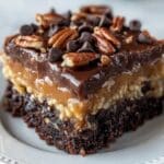 The image shows a square piece of dessert with three distinct layers. The bottom layer is a dark, rich chocolate cake with a soft texture. The middle layer is a gooey caramel mixed with chopped nuts, creating a sticky and crunchy texture with a golden-brown color. The top layer is a smooth chocolate glaze covered with whole pecans and dark chocolate chips scattered across the surface. The dessert is placed on a white plate with a subtle decorative edge, set on a white marbled surface. Photo taken with an iphone --ar 4:5 --v 7
