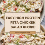 Keywords: feta chicken salad, high protein chicken salad, no cook chicken salad, Greek chicken salad, easy chicken salad recipe, healthy lunch, Mediterranean chicken salad