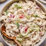 This Easy High Protein Feta Chicken Salad is a flavorful, no-cook dish combining tender cooked chicken with tangy feta, crunchy celery and onion, and a creamy Greek yogurt and mayonnaise dressing. Enhanced with pepperoncini, roasted red peppers, hot honey, and fresh herbs, it offers a bold Mediterranean-inspired flavor that requires just 10 minutes to prepare. Perfect for a satisfying, protein-rich lunch or light dinner.
