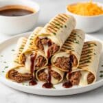 Store leftover roll ups in an airtight container in the refrigerator for up to 2 days. To reheat, place them on a baking sheet and warm in a 350°F (175°C) oven for 8–10 minutes to keep the tortillas crisp. Store leftover au jus in a sealed container in the fridge for up to 3 days and reheat gently on the stove before serving.