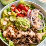 Keywords: burger bowl, low carb burger, ground beef bowl, special sauce, quick guacamole, healthy burger, no bun burger, keto burger bowl