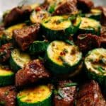 - Combine Steak and Vegetables: Return the seared steak bites to the skillet with the zucchini and garlic butter. Toss everything together to coat the steak and veggies evenly in the flavorful sauce.