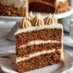 A close-up of a three-layer carrot cake slice on a white scalloped plate, each layer rich brown with visible carrot bits and moist texture, separated by smooth, creamy light beige frosting. The top layer is fully coated with the same light beige frosting, decorated with six evenly spaced vertical swirls of dollops made of the same frosting, adding texture and depth. In the background, the rest of the cake can be seen out of focus on a white cake stand, all placed on a white marbled surface. photo taken with an iphone --ar 4:5 --v 7