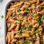 Keywords: taco pasta, high protein pasta, creamy taco pasta, lean ground beef recipe, Tex-Mex pasta, easy weeknight dinner, healthy pasta dish