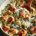 This high-protein spinach and artichoke chicken casserole combines tender shredded chicken with fresh spinach, artichoke hearts, and a creamy blend of Greek yogurt, cream cheese, and cheeses. Baked until bubbly and golden, it’s a nutritious, comforting meal packed with flavor and ideal for a wholesome dinner.
