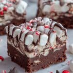 A close-up view of a square dessert bar with three layers: the bottom layer is dense and dark brown, looking fudgy with a rough texture; the middle layer is lighter brown with white bits mixed in; the top layer is a thick layer of white marshmallows that are slightly melted and puffed up, sprinkled with small red and white crushed peppermint pieces; thin dark brown chocolate drizzle runs over the top and down the sides; the dessert sits on a white marbled surface with scattered smashed peppermint bits and a single chocolate chip nearby, with another similar bar blurred in the background. photo taken with an iphone --ar 4:5 --v 7