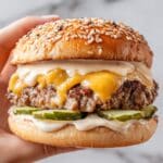 This Irresistible Smash Burger recipe features juicy 80/20 ground beef patties smashed to crispy perfection on a hot grill or skillet. Topped with melty American cheese and served on soft brioche buns with a flavorful secret sauce made from mayonnaise, ketchup, Dijon mustard, and pickle juice, this classic American burger is elevated with fresh toppings like lettuce, tomato, pickles, and onions for a mouthwatering meal perfect for any burger lover.