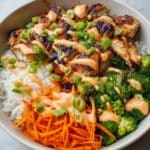 5. Assemble the Bowls: Place cooked rice into serving bowls, top with cooked chicken and sautéed vegetables. Drizzle generously with the gochujang cream sauce. Garnish with chopped green onions and a sprinkle of sesame seeds for extra flavor and texture.