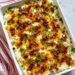 The image shows a white rectangular baking dish filled with a cheesy casserole. The base layer is a creamy mixture with small pieces of white cauliflower, topped with melted golden yellow cheddar cheese. Scattered over the cheese are small, crispy dark red bacon bits and finely chopped green chives for a fresh color contrast. The dish sits on a white marbled surface next to a white cloth with red stripes. photo taken with an iphone --ar 4:5 --v 7