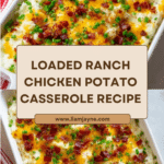This Loaded Potato Ranch Chicken Casserole is a comforting, one-dish meal featuring tender Yukon gold potatoes seasoned with ranch dressing and herbs, layered with juicy diced chicken breast, and topped with crispy bacon, melted Mexican cheese blend, and fresh green onions. Baked to perfection, it offers a creamy texture, smoky flavor, and vibrant colors, making it an ideal family-friendly dinner that’s both hearty and flavorful.