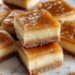 The image shows square-shaped dessert bars with three visible layers. The bottom layer is a thin, golden-brown crust with a slightly crumbly texture. Above it, there is a thick middle layer that is pale yellow and looks dense and moist. The top layer is a shiny, smooth caramel glaze that has a rich golden amber color, giving the bars a glossy finish. The bars are placed close together on a white marbled surface. Photo taken with an iphone --ar 4:5 --v 7