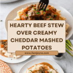 This hearty and comforting Mashed Potatoes with Beef Stew recipe combines tender, slow-cooked sirloin in a flavorful apple cider and beef broth stew served over creamy mashed potatoes enriched with sour cream, cheddar cheese, and fresh chives. Perfect for a satisfying family dinner, this dish brings together rich savory flavors with a velvety texture.