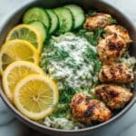 Keywords: Mediterranean chicken bowl, lemon dill chicken, Greek yogurt sauce, healthy chicken recipe, gluten free chicken bowl, quick dinner, grilled chicken bowl, simple meal prep