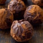 The image shows several round chocolate truffles with a rough, textured surface of dark brown chocolate. Each truffle appears to have a thick, uneven chocolate coating with small patches revealing a lighter brown inner layer. They are placed closely together on a dark wooden surface. The truffles have a handmade look with visible swirls and ridges on the chocolate coating, giving them a rich and rustic appearance. photo taken with an iphone --ar 4:5 --v 7