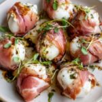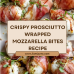 These Prosciutto Wrapped Mozzarella Bites are a delicious Italian appetizer featuring creamy fresh mozzarella balls wrapped in savory, crispy prosciutto and seasoned with aromatic herbs and spices. Perfectly baked to golden perfection, these bite-sized treats make a perfect party snack or elegant starter.