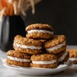 Delicious homemade pumpkin oatmeal cream pies featuring soft and chewy pumpkin oat cookies sandwiched with a luscious maple brown butter cream cheese frosting. These spiced cookies are perfect for fall and bring a comforting, indulgent treat that’s easy to make and sure to impress.