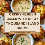 Reuben Balls are a delicious twist on the classic Reuben sandwich, combining savory corned beef, tangy sauerkraut, and Swiss cheese into crispy, bite-sized treats. Served with a spicy Thousand Island dipping sauce, they’re perfect as a crowd-pleasing appetizer or party snack.