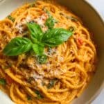 A close-up view of a bowl of spaghetti pasta coated in a creamy orange-red sauce with small bits of vegetables and herbs mixed in, topped with shredded white cheese and fresh green basil leaves placed in the center, all served in a white bowl set on a white marbled surface. Photo taken with an iphone --ar 4:5 --v 7