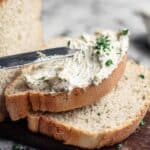 The image shows three slices of soft, light brown bread with a slightly rough texture on a dark wooden board. The top slice has a creamy white spread being applied with a silver knife, creating a smooth layer with tiny green herb bits visible within the spread. Small chopped green herbs are sprinkled on and around the bread on the board, adding contrast to the beige and white tones. The background is a white marbled texture, enhancing the focus on the bread and spread. photo taken with an iphone --ar 4:5 --v 7