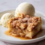 A close-up of a white plate shows a single square piece of warm apple cobbler with a golden brown, crumbly top layer covered in cinnamon sugar crystals. Below this textured crust is a soft, moist layer of lightly baked dough soaked in thick, sticky syrup that has pooled around the edges. To the left of the cobbler, there is a round scoop of creamy vanilla ice cream with a smooth and slightly melting surface. The plate sits on a white marbled texture surface. photo taken with an iphone --ar 4:5 --v 7