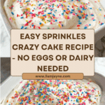 Keywords: Crazy cake, egg-free cake, no dairy cake, vanilla cake, easy cake recipe, sprinkle cake, allergy-friendly cake, 8×8 cake, simple dessert, celebration cake