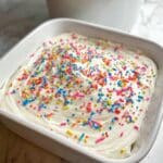 - Cool and decorate: Allow the cake to cool completely in the dish before topping it with your favorite white or vanilla frosting, or simply dust with powdered sugar. Optionally, decorate the top with extra rainbow sprinkles for added color and fun.