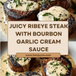 Keywords: steak recipe, bourbon garlic sauce, ribeye steak, creamy sauce, dinner recipe, American cuisine, sautéed garlic, heavy cream sauce