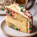 This Sugar Cookie Cheesecake combines the tender sweetness of sugar cookie crust and dough with creamy cheesecake and a luscious white chocolate ganache. Sprinkled with festive jimmies and studded with tiny cookie dough balls, it’s a delightful holiday treat that tastes as good as it looks.