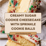 Keywords: Sugar Cookie Cheesecake, sprinkles cheesecake, holiday dessert, festive cheesecake, white chocolate ganache, cookie dough cheesecake