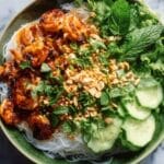 - Assemble the bowls: Divide the cooked noodles among serving bowls. Top with the cooked chicken, cucumber salad, crushed peanuts, and fresh herbs such as mint, cilantro, and basil for a burst of freshness.