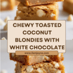 Keywords: Toasted Coconut Blondies, Blondies recipe, White Chocolate Blondies, Coconut dessert, Brown sugar blondies, Easy baked bars