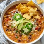 Store leftover tortilla soup in an airtight container in the refrigerator for up to 4 days. Reheat gently on the stove or in the microwave, stirring occasionally. The soup may thicken when chilled; add a splash of broth or water when reheating to restore the desired consistency.