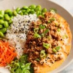- Assemble the Bowls: In serving bowls, layer cooked rice and your choice of fresh veggies such as shredded carrots, sliced cucumbers, shelled edamame, pickled onions, avocado, and shredded cabbage. Spoon the seasoned ground turkey over the rice and veggies. Drizzle additional bang bang sauce on top and garnish with sliced green onions and sesame seeds.